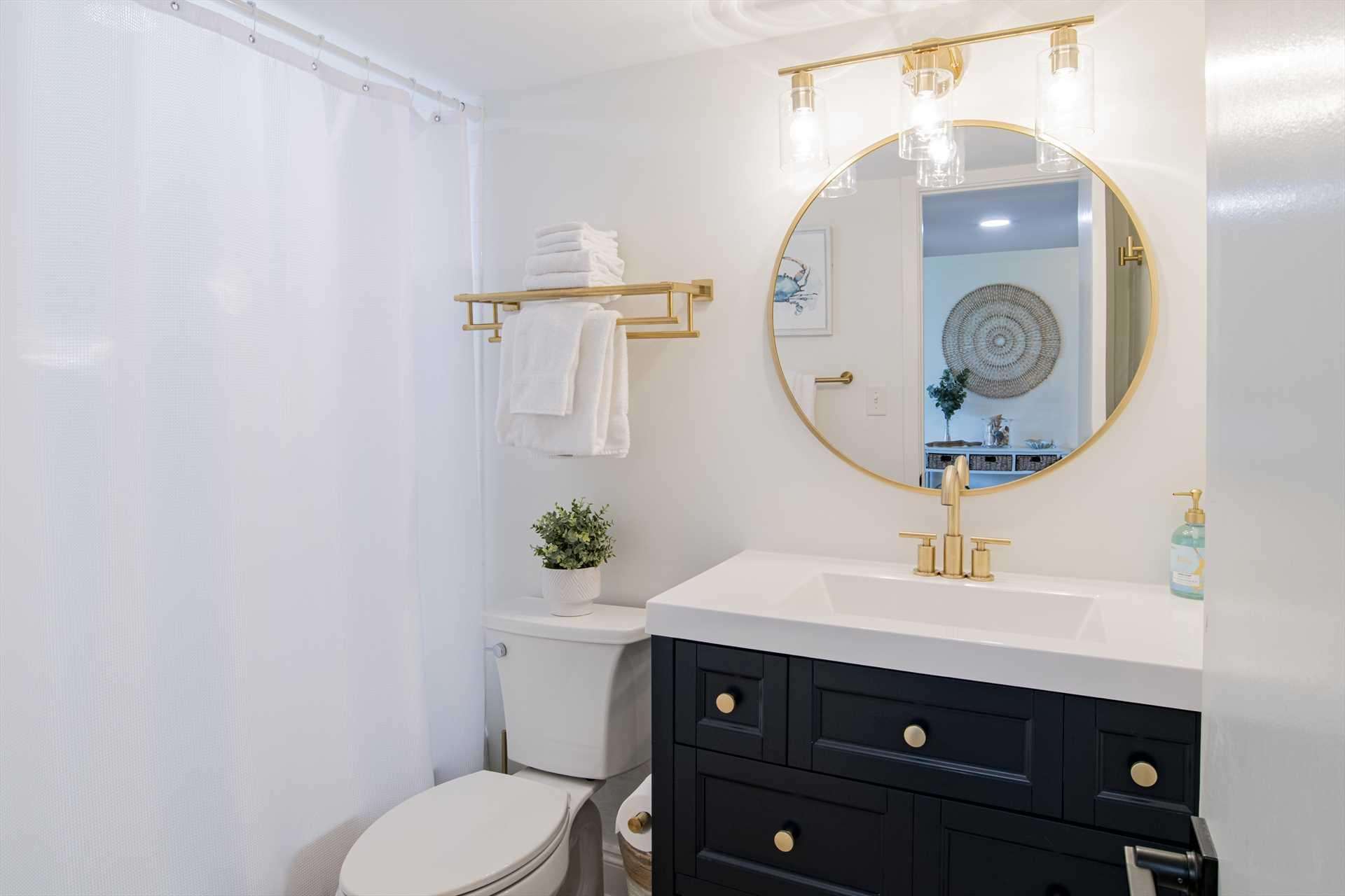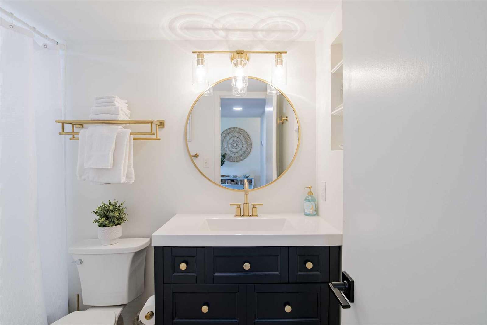 Bright, modern bathroom with elegant round mirror and storage