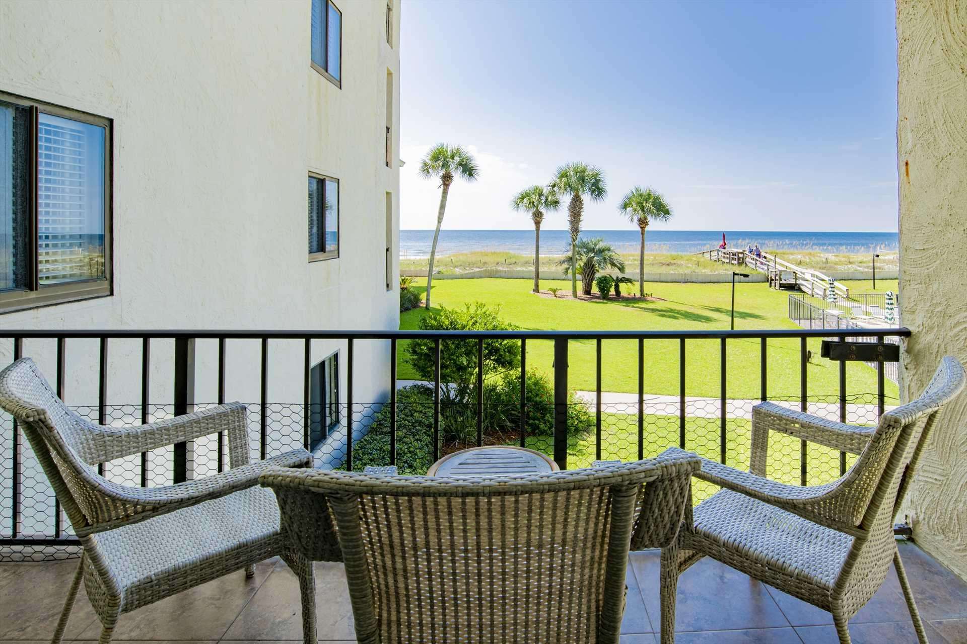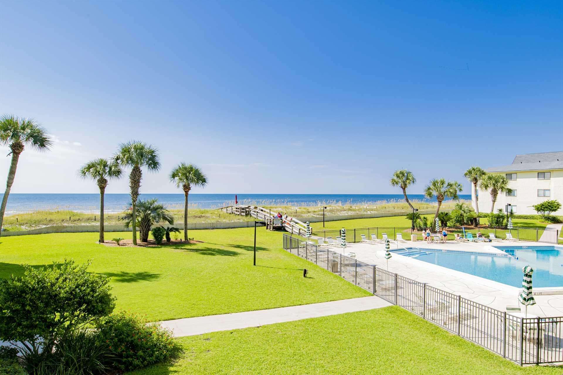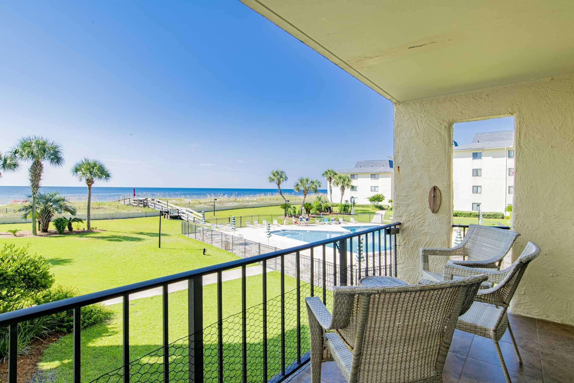 Enjoy breathtaking Gulf views from this charming 2-bedroom beachfront retreat in Pensacola. Relax on the balcony, swim in the pool, or stroll the pristine beach just steps away.