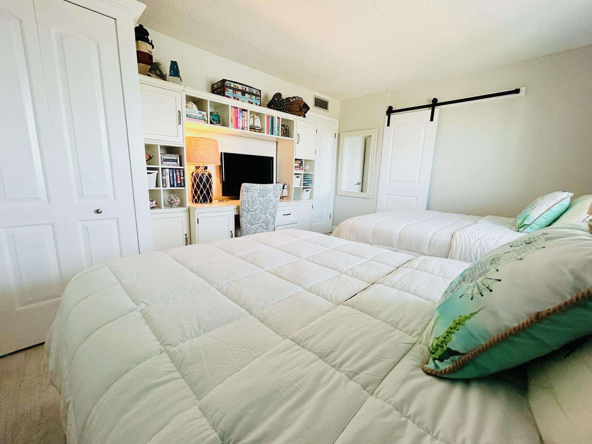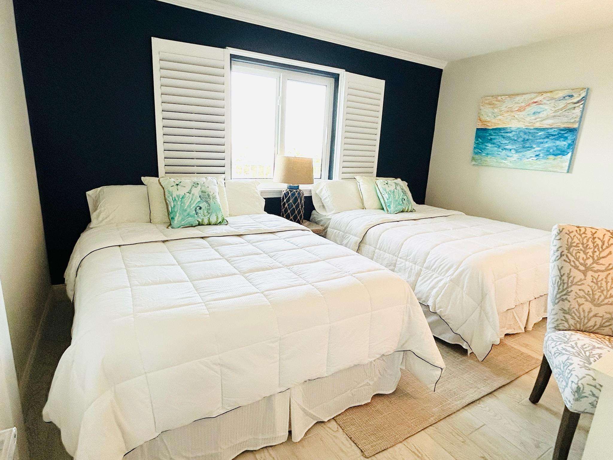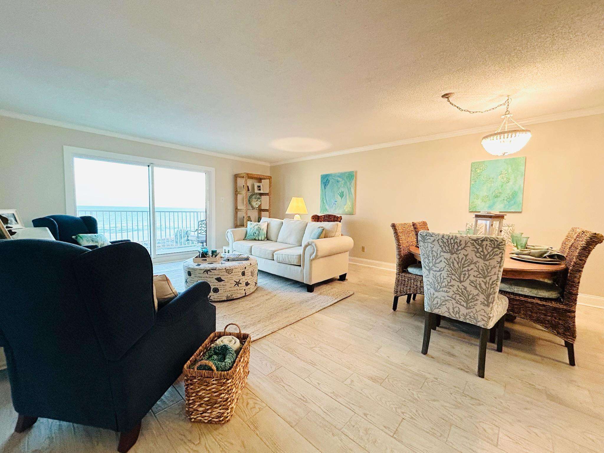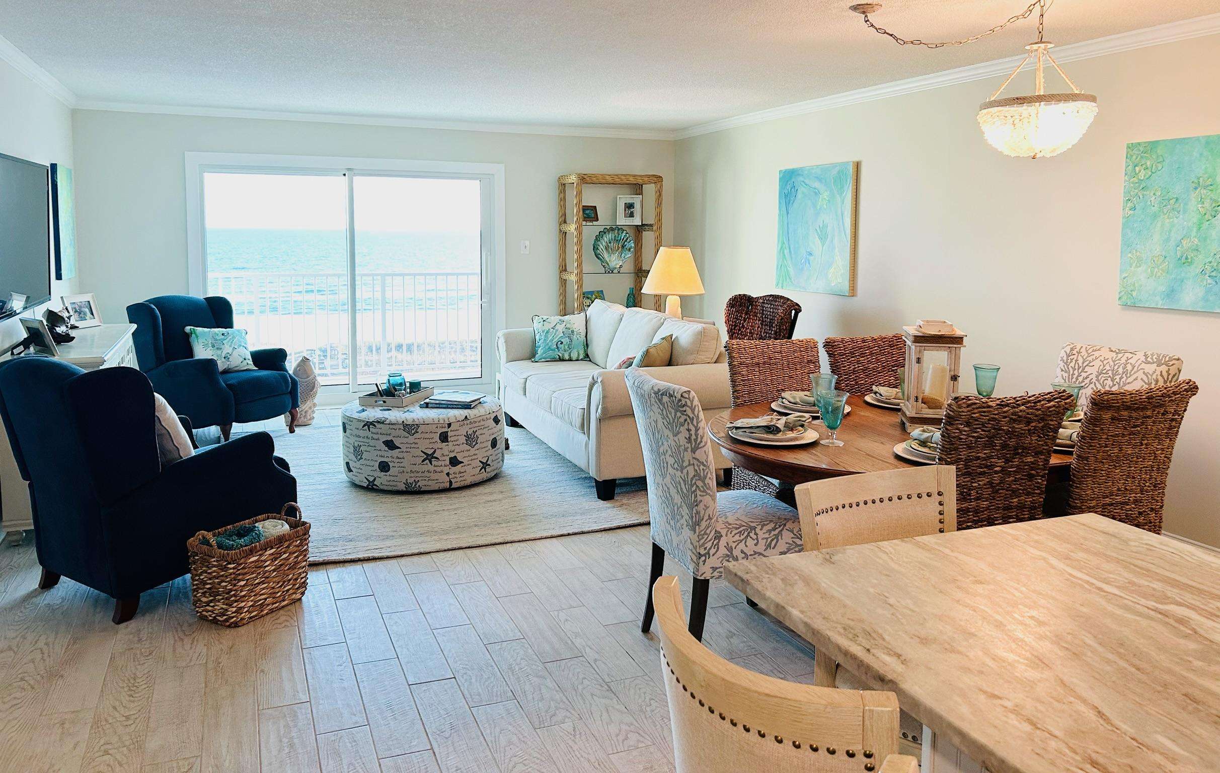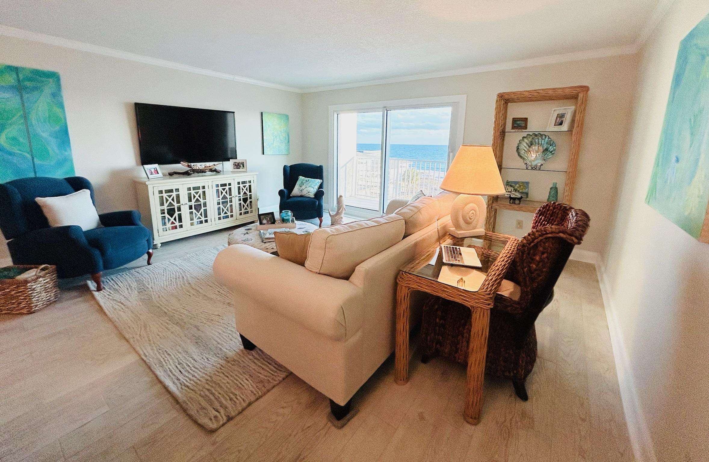 Enjoy coastal luxury at Mariner 512, a completely renovated spacious 2-bedroom 2-bath beachfront retreat nestled on the pristine shores of Perdido Key in Pensacola, Florida. This prime 5th floor end-unit condo offers peace and tranquility, as well as stunning panoramic views of the Gulf of America from a private balcony perfect for morning coffee or sunset dining and relaxation. Inside this bright and airy unit, you'll find modern comforts, including a fully equipped kitchen with a K cup/drip coffee maker combo, stocked spice rack, pots, pans, and other kitchen essentials to accommodate your culinary endeavors. The kitchen also includes scenic views of Ole River and Ono Island. Added conveniences include an in-unit washer and dryer, smart TVs in every room, and high-speed Wi-Fi for all of your streaming services. The expansive living area offers 2 recliner chairs, a brand-new sleeper sofa, a writing desk and a dining table for 6 guests, making it ideal for unwinding after a day spent enjoying the white sandy beaches and turquoise waves. Custom artwork by The Still Waters Studio compliments the coastal decor of this beautiful property, bringing the beauty of Perdido Key into each room. Wake up to spectacular views of the picture-perfect seashore in the master suite, which features a king-sized mattress, newly renovated ensuite bath, smart TV, and plenty of storage. The second bedroom, offering more wonderful views of Ole River and Ono Island, features 2 queen-sized beds, a large closet, a smart TV, and a Pottery Barn desk and bookcase, complete with an array of books and games to entertain guests of all ages.