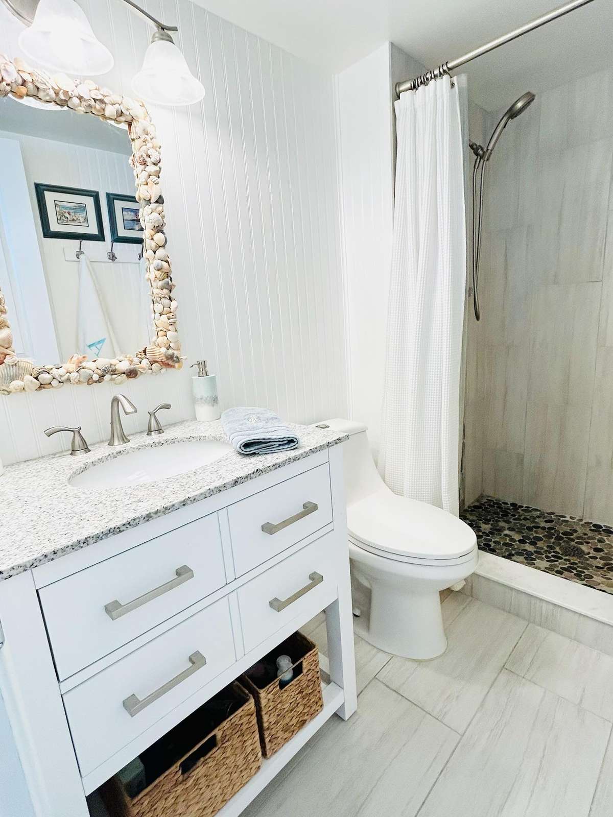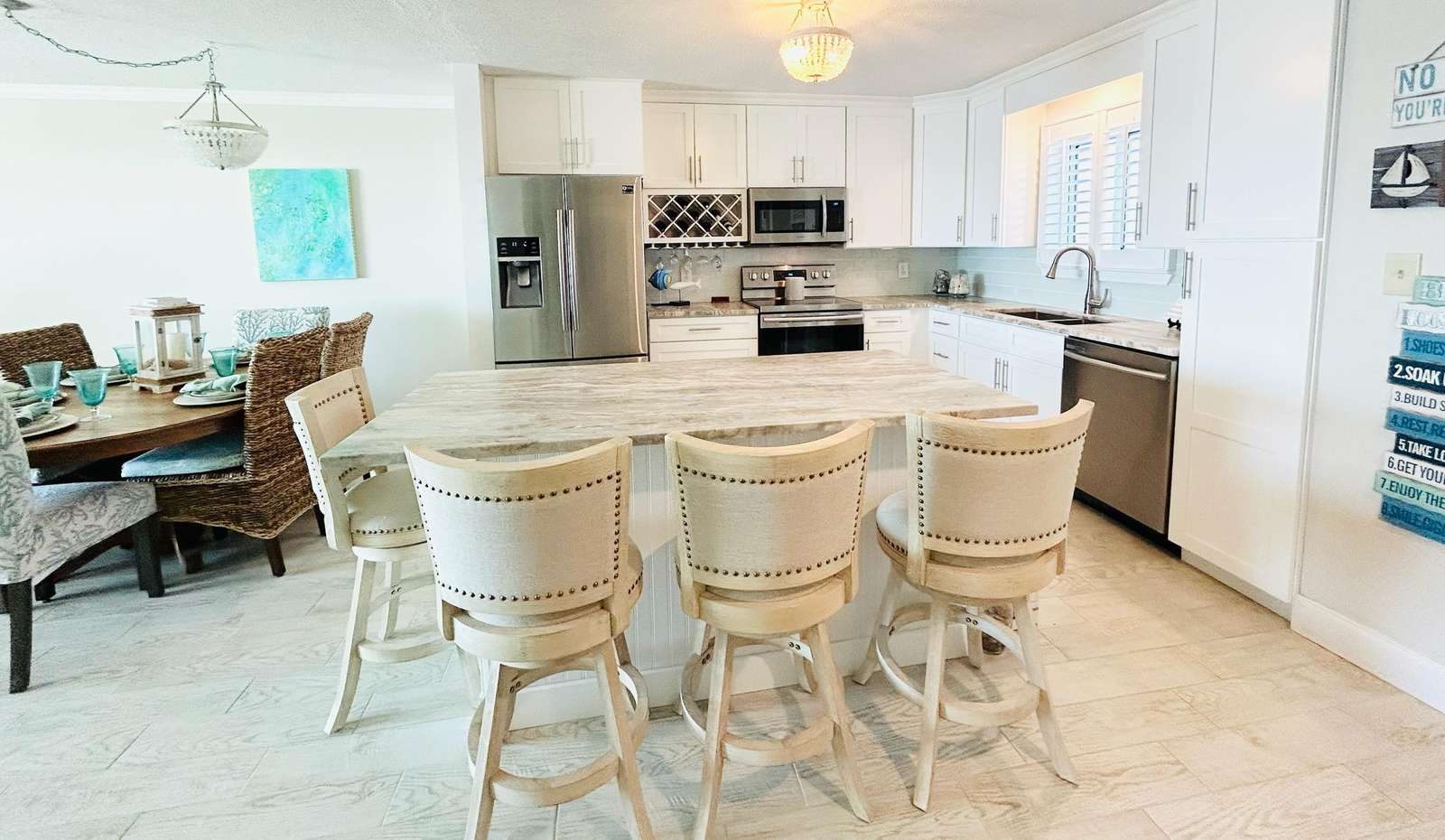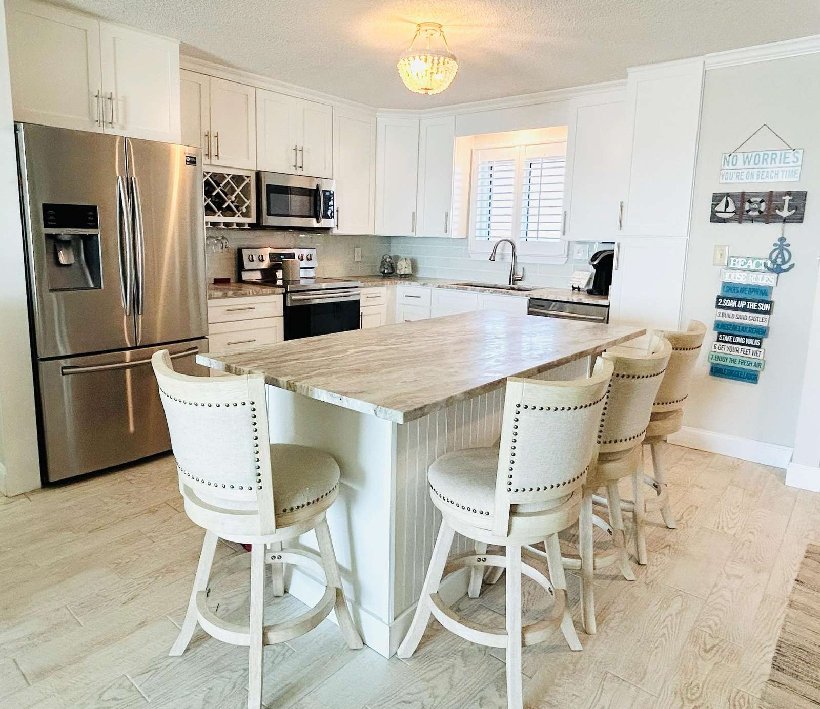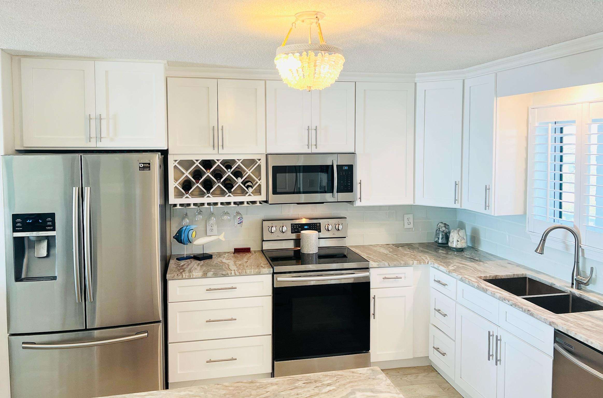 Recent renovations include tile floors throughout the unit, a completely new kitchen with custom granite counter tops, shaker cabinets, stainless steel appliances, and coastal lighting fixtures, as well as two remodeled bathrooms with granite vanity tops and custom tile work in the shower/tub combo and walk-in shower.